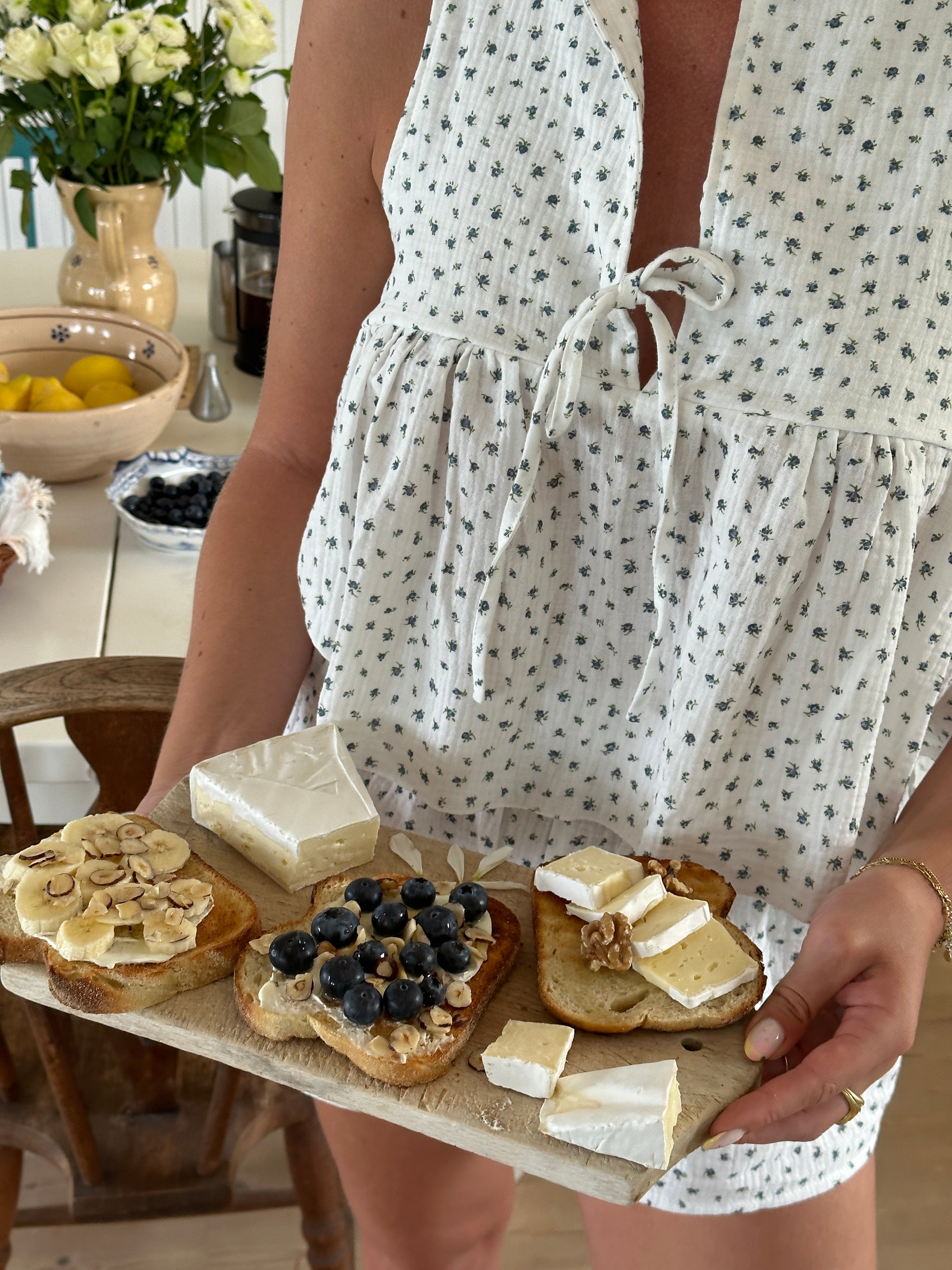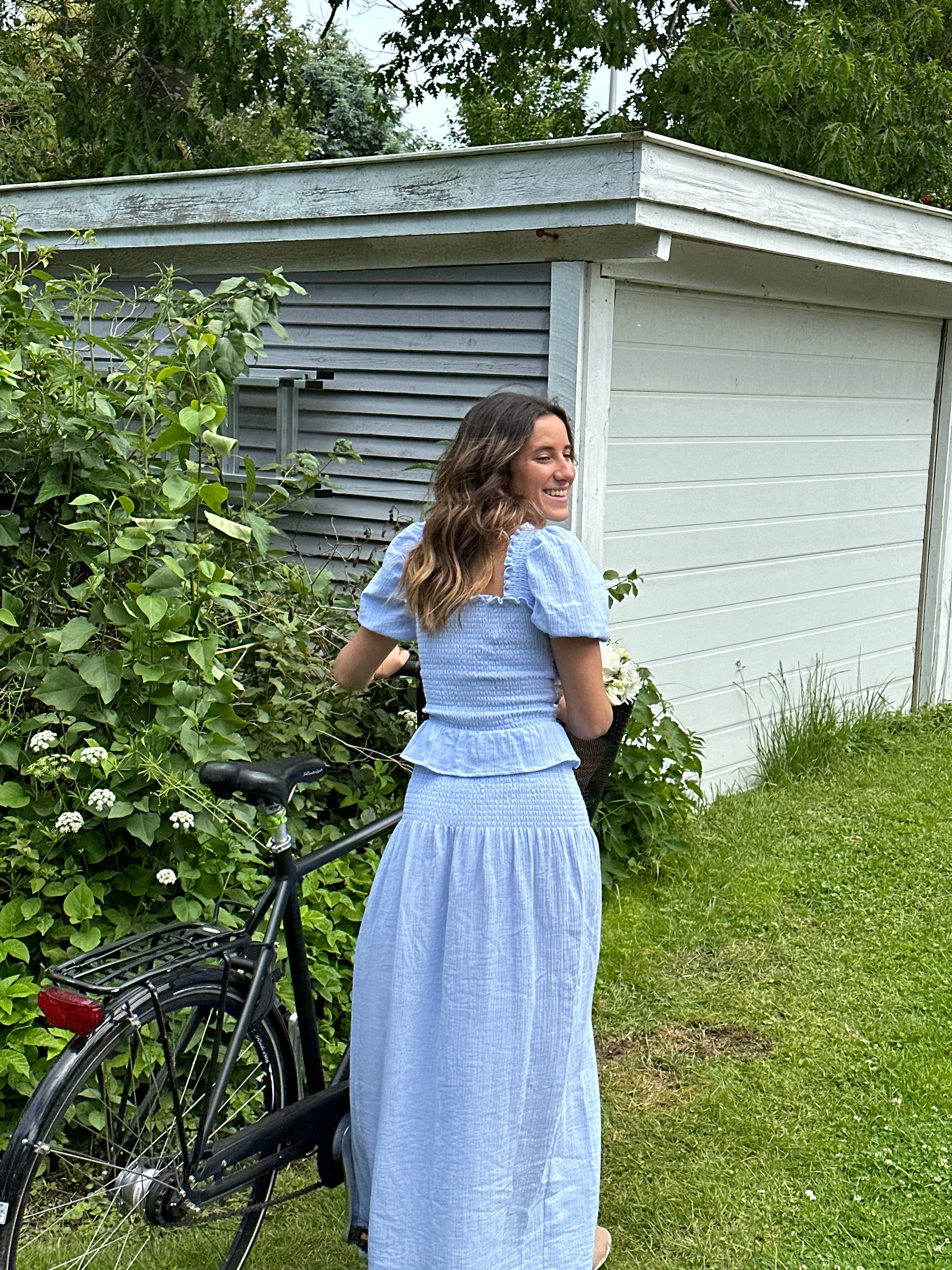 For this collection, we carefully selected soft organic cottons that feel as gentle as a coastal breeze. Delicate floral prints and baby blue tones echo the romantic simplicity of Danish fashion, with a nod to the effortless elegance seen in Nancy Meyers’ iconic wardrobe aesthetics.