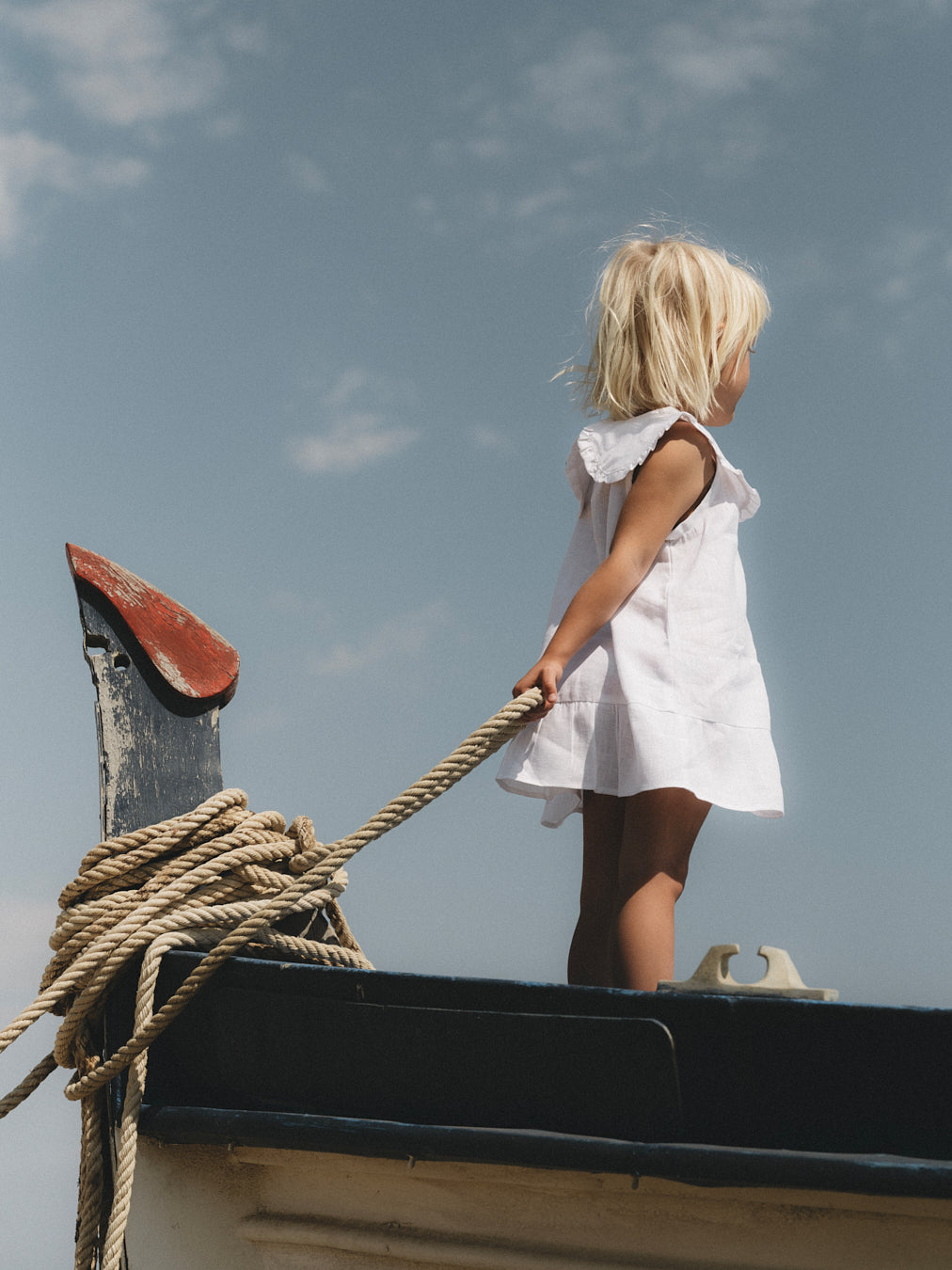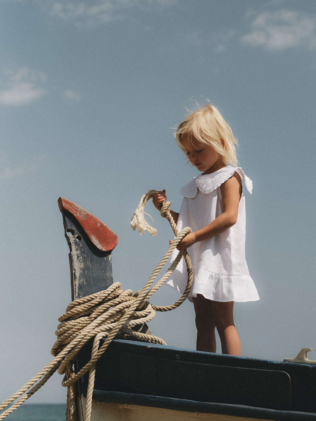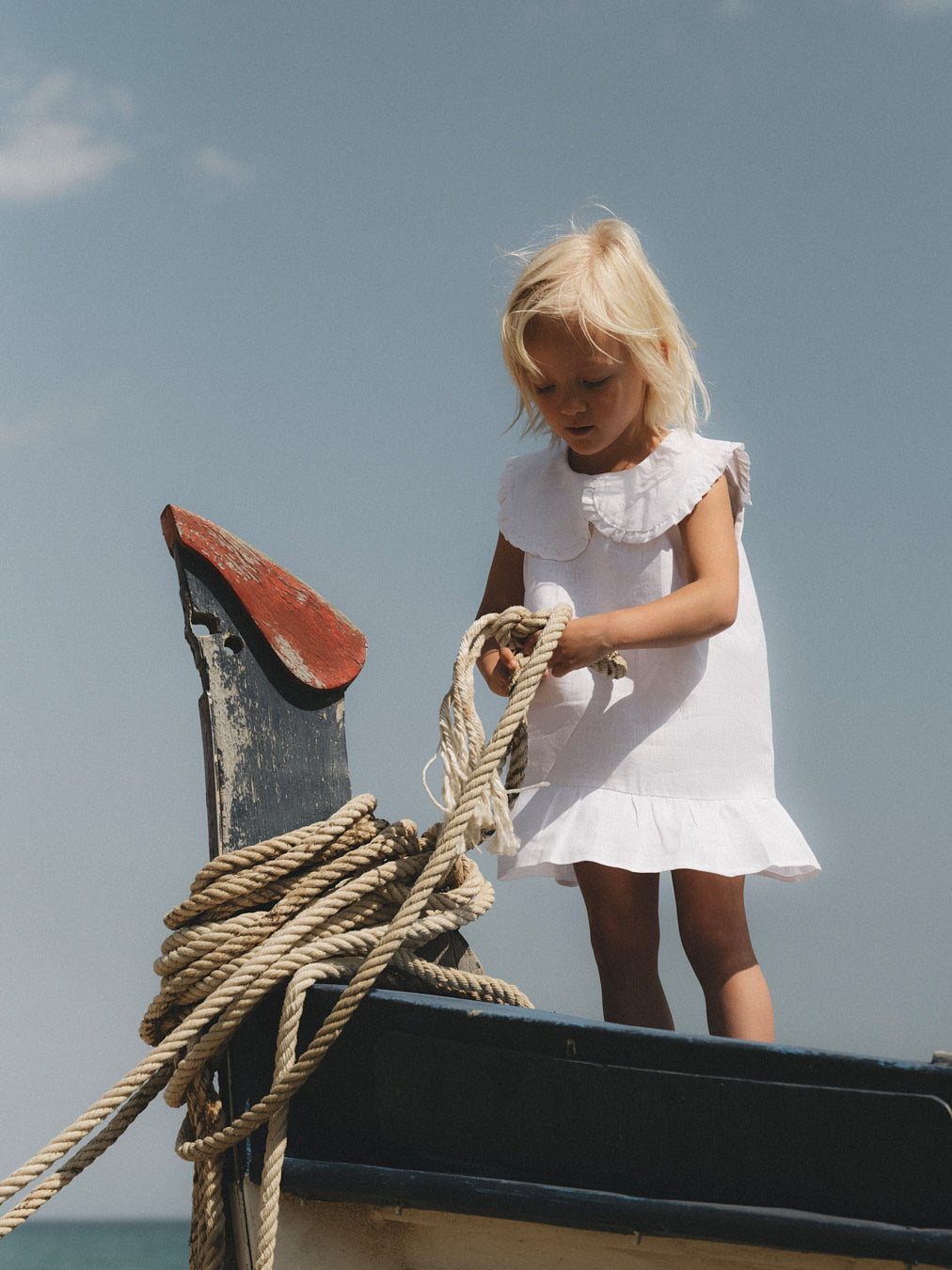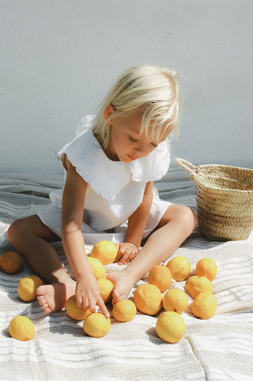 The Mina Dress is a sleeveless dress, crafted from 100% linen, offering a breathable fit and featuring a large Peter Pan collar and a ruffled detail at the bottom.